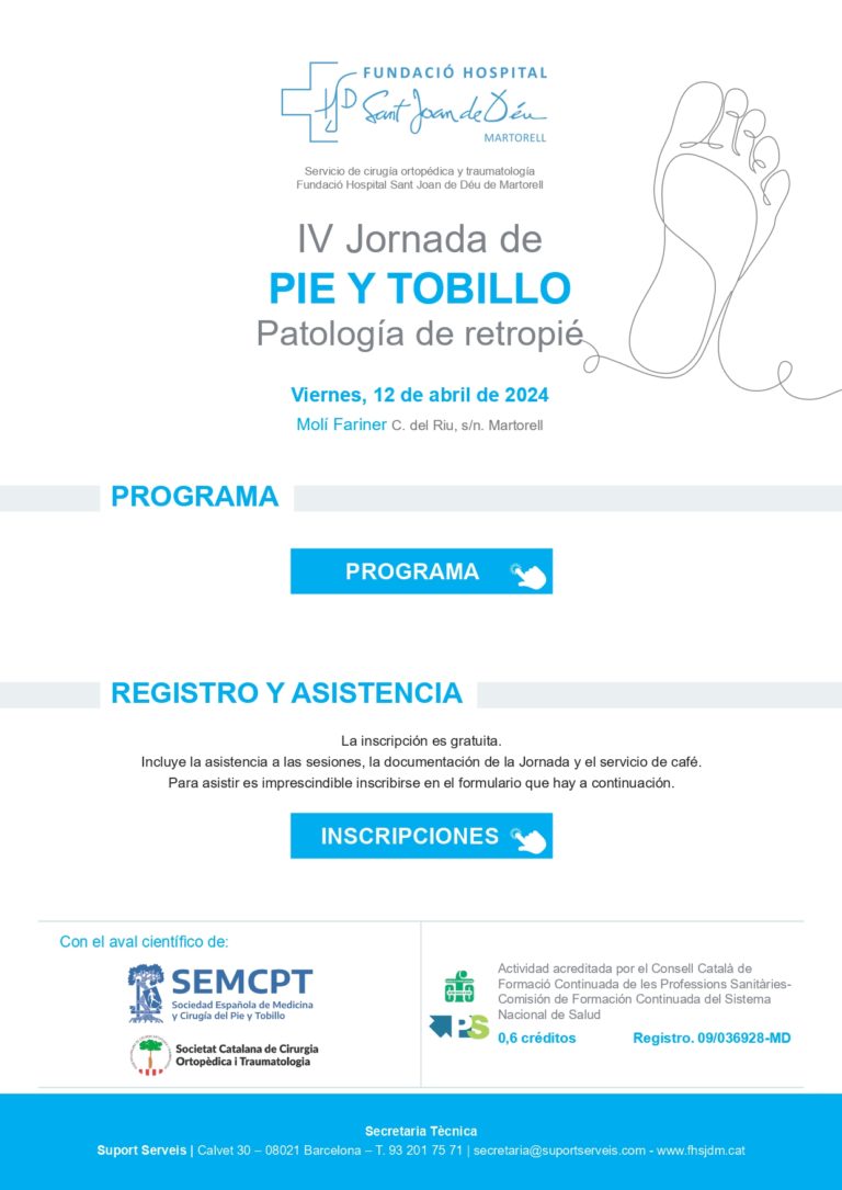 El divendres 12 d’abril, se celebrarà la IV Jornada de Pie y Tobillo. Patología del Retropié, organitzada per la Fundació Hospital Sant Joan de Déu de Martorell (FHSJDM) i avalada […]