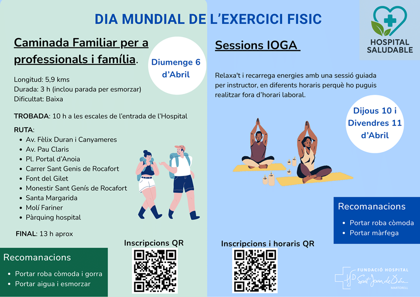Durant aquests dies, els professionals de la FHSJDM podran participar en una caminada familiar i a sessions de ioga per sensibilitzar-se sobre la importància de moure el cos cada dia. A més, s’oferirà informació i recomanacions sobre com integrar l’exercici físic a la jornada laboral i la rutina diària de manera fàcil i accessible.