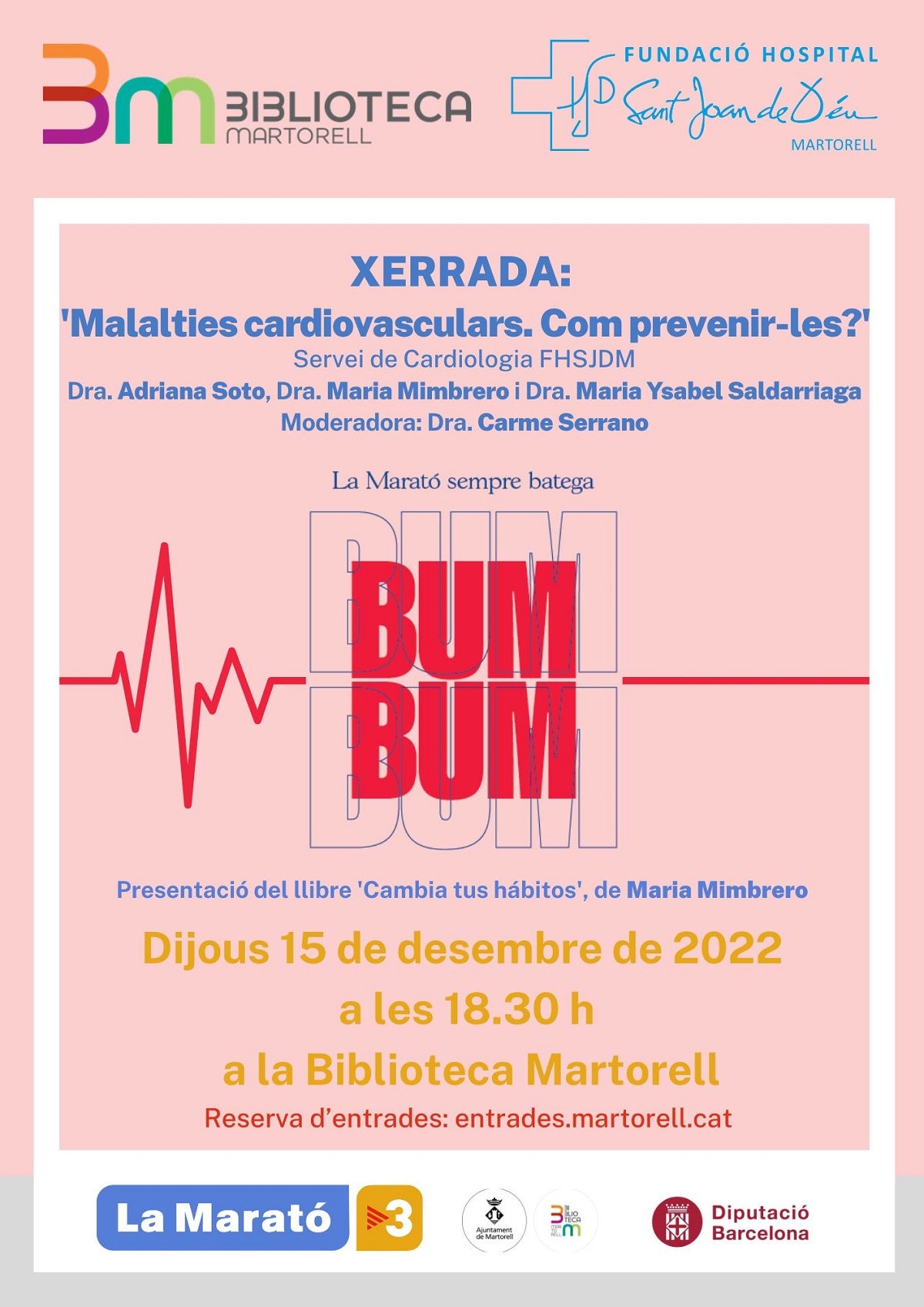 El proper 15 de desembre 2022, la Fundació Hospital Sant Joan de Déu de Martorell (FHSJDM) organitza amb la col·laboració del Patronat Municipal de Serveis d’Atenció a les Persones de Martorell (PMSAPM), una xerrada titulada: “Malalties cardiovasculars. Com prevenir-les?” que tindrà lloc a la Biblioteca de Martorell a les 18.30h, per ajudar a l’edició d’enguany de La Marató.